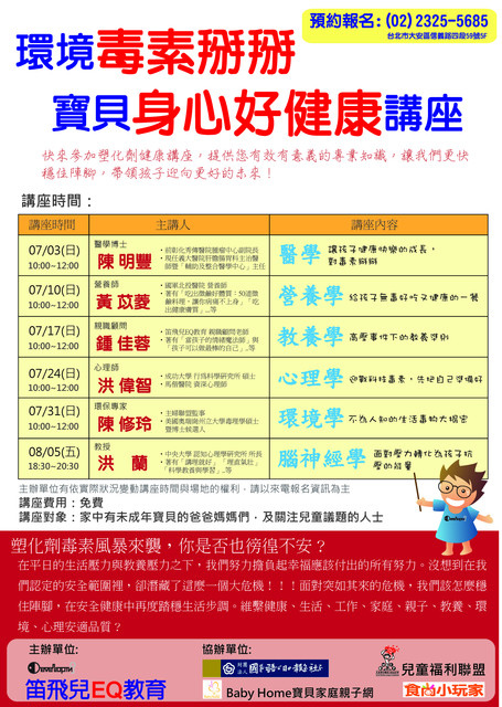 笛飛兒EQ教育以豐富的親職、兒童EQ經驗,力邀各領域專家學者,與國語日報、兒福聯盟、babyhome寶貝家庭親子網、食尚小玩家等熱心公益機構,一起於暑假舉辦多場抗壓拒毒安心講座。獻給期待安心、高生活品質的你!